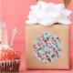 Um adesivo de férias com pinheiros-touro Eurasiáticos pintados a aquarelas que se assemelham a bagas vermelhas e azuis com pinheiros e ramificações, segundo um padrão repetido em fundo branco.