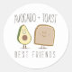 Um adesivo com desenho animado de abacate e um pedaço de torrada com faces. O texto diz "Avocado + Melhores Amigos do Brinde."