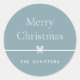 Termine suas mensagens e presentes de Natal com esses adesivos doces e simples de Natal, personalizáveis com seu cartões de natal e assinatura familiar preferidos (mostrados com "Feliz Natal") em um fundo azul suave. Um pequeno arco que corre pelo centro completa este elegante design de feriado minimalista.
