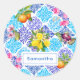 Verão Siciliano azul amarelo floral azulejo Amalfi Mediterrâneo majolica Round Sticker. O padrão floral botânico de jardim de citros inspirado pela brilhante arte temática italiana do verão da majolica. Lindos azulejos de cerâmica sicilianos em amarelo rosa e azul. Um design brilhante estilo divertido para decoração doméstica, roupas, móveis e Capas de ipad, convites e muito mais. Você pode alterar todas as cores e fontes do texto, clicar para personalizar ainda mais abaixo da área de personalização do texto que o levará à ferramenta design. Um presente único para aniversários, feriados e qualquer ocasião especial. Seja para dia de os namorados, Natal ou como um presente em geral, faz uma ideia de presente excelente