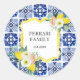 Anime qualquer ocasião com este adesivo redondo clássico! Com um design de citrino de limão amarelo, padrão de azulejos mediterrâneos azul-marinho e charme botânico floral.