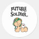 Um bebê vestindo uma fralda com um coração vermelho e um capacete e texto de soldados que diz "Futuro Soldado" aparece em nossas futuras camisetas de soldado, fatos-tronco, sacos de tote e outros itens. Bebês cujo herói está no exército adorarão vestir essas camisetas bonitinhas!