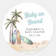 Etiquetas bonitas para surfar em seu bebê convites para chuveiros, favoritos para festas e cartas de agradecimento que apresentam uma ilustração aquosa de uma cena de praia tropical com palmeiras, praias arenosas, estrelas e pranchas de surfe, e "Baby on Conselho" mostrado em um divertido roteiro azul-retrógrado. Acrescentar o nome da mãe e a data de chá de fraldas em letra simples.