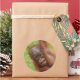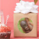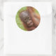 Um orangotango bebê alegre é visto com uma expressão encantadora, seguramente agarrado às costas da mãe. A atmosfera é rodeada por uma folhagem verde-esbranquiçada e brilhante