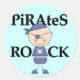 Um pirata-bebê vestido de azul com um boné do crânio azul e adesivo e texto que diz "PiRAteS ROCK!" em T-shirts do Pirates Rock, sacos-tota, cartões, autocolantes, ímanes e outros equipamentos piratas.