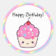 Feliz cupcake de aniversário! Este adesivo apresenta uma ilustração fofinha de um cupcake feliz decorado com gelo cor-de-rosa, aspersores e uma cereja sorridente no topo. Confira todos os produtos correspondentes na loja Super Cute Kawaii.