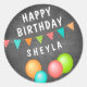Vinhetas de Balão-de-Boca-Boca-Boca-Boca-branca Bons adesivos de aniversário para a celebração da festa de aniversário das crianças. Os balões coloridos e as bandeiras de bunting estão em um quadro de cinzas. Personalize com o nome do seu filho.