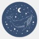 Ilustração de arte em linha de uma baleia sobre um fundo azul de estrelas e uma lua.