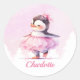 Um design bonito de um pinguim bebê vestido de bailarina num tutu cor-de-rosa com um fundo de neve branco e rosa pálido. Faz um adesivo de excelente para adicionar presentes para uma filha, neta, filha boa ou qualquer outra garotinha. Personalizar com um nome