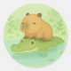 Uma capybara sonolenta a calmar-se num crocodilo verde amigável num lago pastel calmo. Este adesivo de estilo 'soft' cartoon adiciona vibrações tranquilas e peculiares a laptop, notebooks ou presentes para amantes de os animais.