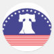 Imagem do Bell da Liberdade, senta-se sobre um fundo azul arquitetado com estrelas brancas, acima de uma fundação de listras vermelhas