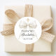 Celebrate your child’s Baptism with this elegant round sticker featuring a luxurious ivory bow with delicate pearl details and a subtle gold cross on a classic white background.