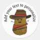 Uma adorável batata marrom vestida de chapéu de cowboy, uma bandana vermelha e um lasso no cinto. Acima dele está um modelo de texto curvo em texto preto para você personalizar esses adesivos bonitos.