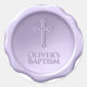 Dentro a lavanda (roxo claro) selo de cera com contorno irregular, há uma cruz gravada com o texto "Batismo do [nome]" embaixo dela (Não está realmente gravado, a ilusão de gravuras é simulada no trabalho de arte). O selo de cera é uma versão colorida de uma foca feita por Gerhard Janson, de Pixabay, e está livre para uso comercial.