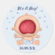 A ilustração do bebê está vestindo uma fralda com lágrimas voando e boca bem aberta enquanto ele está chorando. O texto diz que é um menino. Bom humor para o Novo Pai e a Mãe. Personalizar data.