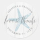 Um adesivo de favorito para o casamento na praia redonda para um casamento na praia rústica com uma ilustração típica de estrelas-do-mar e fonte clássica de serifa tradicional e caligrafia elegante "amor e obrigados" com nomes e data de casamento. Clique em PERSONALIZAR AINDA para alterar as cores ou fontes a serem coordenadas com o evento.