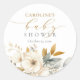Bebê Floral Neutral Elegante No Chá de fraldas de Sangue, o adesivo redondo clássico apresenta lindas flores florais brancas, azuis e douradas e verde juntamente com a caligrafia moderna.