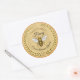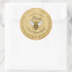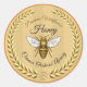 Terra ou terra das folhas em torno de uma abelha de mel que se estende sobre faixas de ouro numa borda de ouro âmbar. Edite a inscrição personalizada de scripts para o tipo de mel, cera de abelhas, velas e outros produtos de suas abelhas, com texto redondo para recursos do produto, apicultor ou nome apiário profissional e peso líquido.