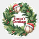 Esses adesivos/ selos de envelope personalizáveis de beisebol temáticos de Natal apresentam ilustrações de uma coroa de Natal perene com beisebols com boné de Papai Noel. Mensagem personalizável de "Saudações da Temporada" no centro para adicionar sua própria mensagem de Natal personalizada para familiares, companheiros de equipe, clientes e muito mais.