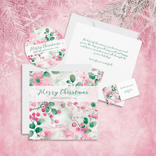 Os varetas de Natal elegantes têm a beleza que queremos nas nossas comemorações de Natal e doação de presentes. Há belas pinks nas bagas e verdes na folhagem de haste de chá nesta coloração de água da safra. Esta é uma bela botânica que vai melhorar as saudações que você envia ou dá aos seus amigos e parentes para as férias de inverno. Todo o texto pode ser editado. Se preferir outra saudação, que não o "Feliz Natal", pode substituí-la. Certifique-se de alterar os nomes de exemplo e a data.