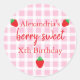 Festa de aniversário de morango doce com morangos e pano de fundo rosado