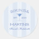 Celebre a noiva com estilo usando este adesivo de festa de despedida de solteira Bikinis & Martinis, perfeito para celebrações na praia ou à beira da piscina! Com um fundo azul listrado moderno, uma ilustração elegante de um copo de martini e uma mistura estilosa de fontes modernas sem serifa e caligráficas, este design traz a combinação perfeita de diversão e sofisticação. Personalize com o nome da noiva e o ano de sua "fundação" para um toque de festa personalizado e memorável. Ideal para sacolas de lembrancinhas, copos de festa, convites ou cartões de agradecimento.