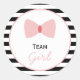 Os gêneros riscados a preto e branco revelam adesivos para chás de fraldas. O design apresenta um padrão listrado preto-e-branco e um círculo com um arco rosa e seu texto.