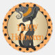 Um gato preto bonito com chapéu de bruxa com texto Feliz de Halloween e bolinhas pretas correspondentes sobre um fundo laranja. Excelente para favores ou correspondência do Halloween. O gráfico de gato giro é original artwork©delightful-doodles.com. Estes adesivos estão disponíveis em tamanho de 1/2 polegada e 3 polegadas. Escolha o tamanho adequado ao seu evento ou projeto.