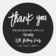 Este simples adesivo de agradecimento personalizado irá adicionar um detalhe elegante ao seu dia especial. Este design apresenta um elegante rótulo de letra pincel "Obrigado" com texto personalizado. Você pode personalizar o texto para qualquer evento. Convites de aniversário de aniversário e suprimentos para festas estão disponíveis na minha loja BaraBomDesign.