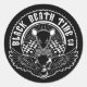 Logotipo comercial fictício para "Black Death Tire Co." Crânio alado e rato com bandeiras marcadas num selo redondo. Disponível em b/w e preto/laranja.