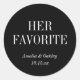 Add a touch of sophistication to your wedding favors with this "Her Favorite" custom round sticker in classic black. Perfect for sealing candy bags, favor boxes, or thank-you gifts, these personalized labels feature the couple's names and wedding date. Ideal for any wedding theme, these sleek, elegant stickers are an easy way to add a personalized touch to your special day. Whether you're preparing wedding favors, candy bags, or party gifts, these custom stickers are the perfect finishing touch for a timeless and elegant event.