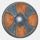 Emblema da Cruz Azul colocado sobre o fundo do escudo redondo de madeira.