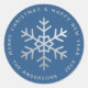 An elegant blue and silver sticker for the holidays greeting card. It has a faux silver foil snowflake in the center and silvery gray text in the circle around it: above it there is the message Merry Christmas & Happy New Year, under it there is the family name and the year. The background is classic blue.