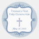 Este adesivo de comunhão/confirmação, azul-redondo personalizado, é uma forma excelente de personalizar o seu favor, selar os seus convites, agradecer-lhe cartões ou usar para etiquetas de presentes. Este design contemporâneo apresenta uma cruz azul e seu texto dentro de um quadro azul-país, definido em um fundo azul-macio.