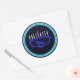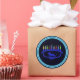 Uma menorah Chanukkah azul, com um tema de leão, com velas acesas sobre fundo estrelado.