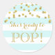 Chá de fraldas que ela esteja pronta para pop a favor de adesivos de etiqueta em azul-bebê claro e padrão de listras brancas com confete dourado, por favor note que brilho é apenas efeito fotográfico. Uma maneira excelente de decorar favores de chá de fraldas de pipoca.