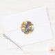 Desenho de linha e aquarela de um pássaro azul empoleirado numa pose contemplativa sobre um fundo foliar em tons dourados e azuis.