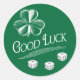 Dê aos seus jogadores do Bunco um adesivo da Boa Sorte para vestir na próxima noite do Bunco. Vintage style shamrock, texto de boa sorte e três dados brancos Bunco. Design verde e branco é perfeito para o seu evento de março.