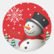 O boneco de neve está vestindo um chapéu preto e um cachecol vermelho. O fundo cobriu árvores e flocos de neve no fundo vermelho. Esta é uma ilustração digital.