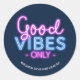 Bons Vibes Apenas Neon Sign Divertido Tendy Clássico Round Sticker. Diversão e design positiva com um sinal de neon com o ditado "Belas Víblias Apenas". Muito estilo retrô dos anos 80. O texto abaixo é personalizável. Exclua o texto se você não quiser uma versão personalizada.