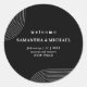 O adesivo apresenta um esquema de cores preto e branco elegante com um padrão de arte geométrica cativante. A combinação de linhas limpas e design moderno cria um olhar chic e eterno que complementará qualquer tema de casamento ou decoração. Com a palavra "Bem-vindo" mostrada elegantemente no centro, este adesivo serve como uma saudação calorosa aos seus convidados, definindo o tom para uma celebração memorável. Quer você esteja usando para selar convites, personalizar favores, ou decorar sua papelaria de casamento, este adesivo redondo clássico adiciona um toque de refinamento a cada detalhe.