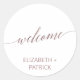 Estes elegantes adesivos de boas-vindas para caligrafia rosa são perfeitos para um casamento simples. A design cor-de-rosa-pincelada apresenta um adesivo minimalista decorado com tipografia da folha de ouro rosa romântica e caprichosa. Personalize o rótulo com os nomes da noiva e do noivo. Nota: Este design não apresenta folha de ouro rosa real. É um gráfico de alta qualidade feito para se parecer com folha de ouro rosa.