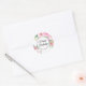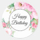 O adesivo de aniversário redondo feliz é mostrado com um impressão floral rosa bonito. Personalizar ou comprar como está.