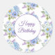 Um pequeno adesivo de aniversário feliz redondo é mostrado com um adorável impressão floral azul e roxo. Personalizar ou comprar como está. Impressão de ações freepik.com