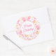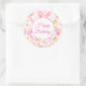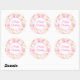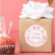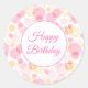 Um grande adesivo de aniversário feliz redondo é mostrado com um impressão de círculos rosa festivo. Personalizar ou comprar como está.