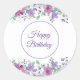 Um grande adesivo de aniversário feliz redondo é mostrado com um impressão floral roxo adorável. Personalizar ou comprar como está. Impressão de ações freepik.com