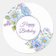 Um pequeno adesivo de aniversário feliz redondo é mostrado com um adorável impressão floral azul e roxo. Personalizar ou comprar como está. Impressão de ações freepik.com