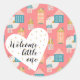 Bem-vindos O Pequeno Boho Bebê abriga o Scandi Classic Round Sticker - Casas desenhadas à mão em tons de azul, cor-de-rosa e bronzeado num fundo cor de salmão com um grande coração branco dizendo Welcome Little One. Este adesivo é adorável para qualquer criança.