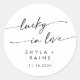 Este boho chic black e branco sortudo em amor por um adesivo redondo clássico é perfeito para um casamento minimalista. O design boêmico preto-e-branco, moderno, apresenta uma caligrafia rústica simples com um estilo único, mas clássico. Perfeito para qualquer estação: primavera, verão, outono ou inverno. Personalize seus adesivos de favor com seus nomes e data de casamento.