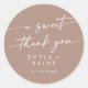 Este boho neutro ensinou um doce obrigado que você prefere um adesivo redondo clássico é perfeito para um casamento minimalista. A design boêmica moderna de tom castanho bege apresenta uma caligrafia rústica simples com um estilo único, mas clássico. Personalize seus adesivos de favor com seus nomes e data de casamento.